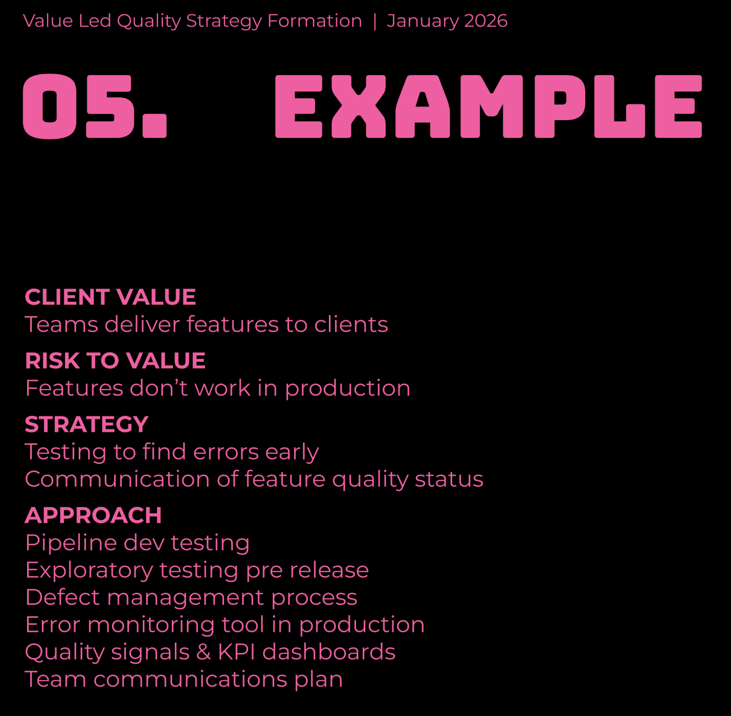 The way I see it, the goal maps to the quality attributes your stakeholders care about. Diagnosing the problem requires stakeholder input, as well as info from QEs on how quality is created, maintained, and lost in your system. Techniques like layers of testing and software feedback rings can feed into guiding policy, and a quality mapping session can help teams agree on coherent actions. Via Value Led Formation of Quality Strategy Infographic | Callum Akehurst-Ryan | LinkedIn